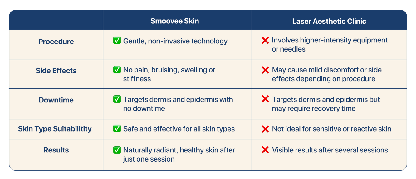 See how Smoovee Skin stands apart from traditional laser aesthetic clinics.